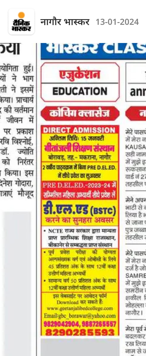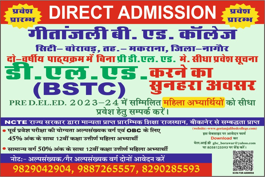 Geetanjali Shikshan Sansthan Borawar, Tehsil-Makrana Distt. Nagaur (Raj.) Pin 341502 Mobile: 9887265557 / 9829042904 / 8058125593 Landline: 01588-248756